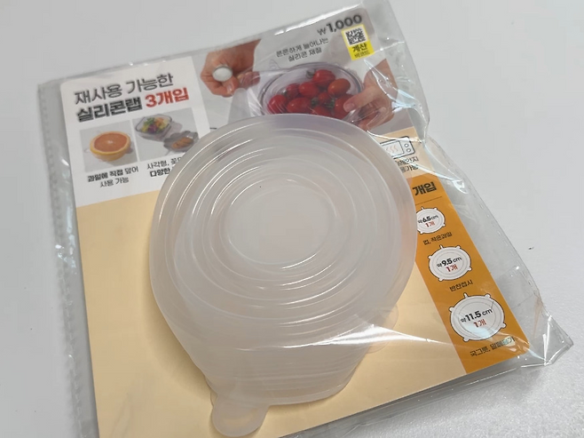 포장에도 적혀 있듯이 재사용이 가능한 실리콘 랩입니다. 가격은 천 원이지만 크리가 다른 랩이 3개나 들어있습니다.