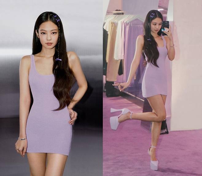 공개된 사진은 이날 제니가 팝업 매장에서 스퀘어 네크라인의 초밀착 민소매 니트 원피스와 킬힐까지 바아올렛으로 깔맞춤한 핫섬머룩으로 포즈를 취하며 셀카를 찍는 모습이 담겼다.