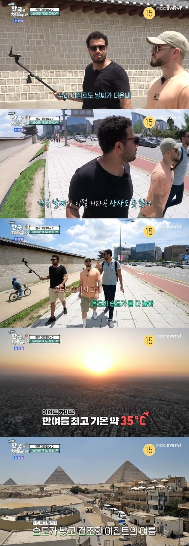 이날 방송에서 이집트 세 친구는 경복궁을 다녀오며 무더위에 어쩔 줄 몰라 했다. 33도로 폭염경보가 내린 상황. 세 친구는 “이집트도 날씨가 더운데 한국 날씨가 이럴 거라곤 상상도 못했다”, “한국은 온도와 습도가 둘 다 높다”고 탄식했다.