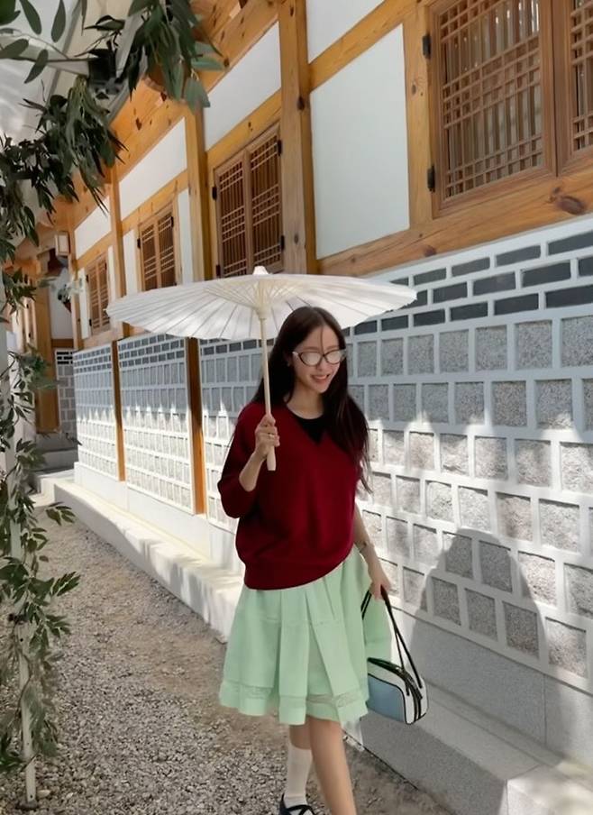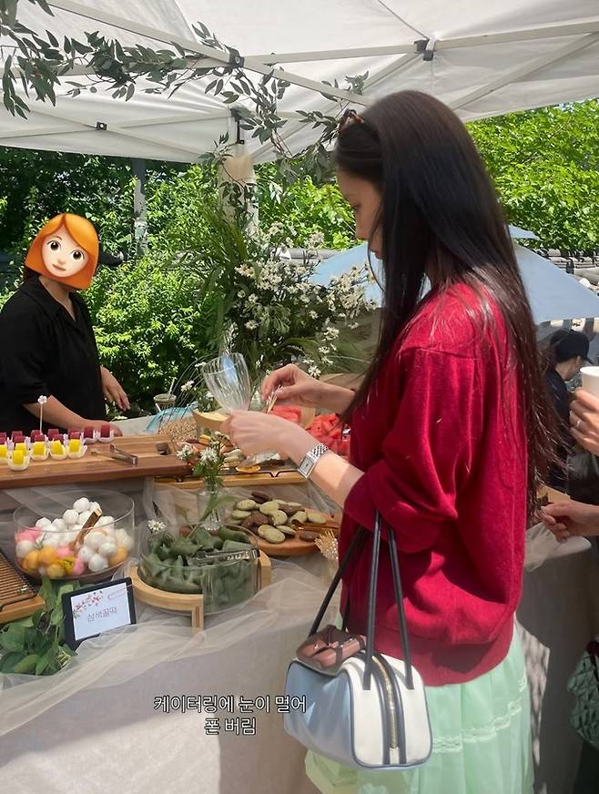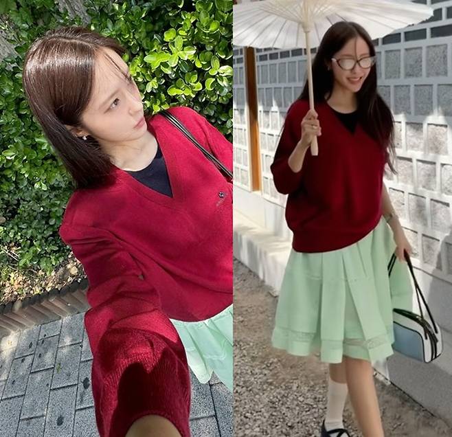 공개한 사진에서 효민은 레드 컬러의 브이넥 스웨터에 카키 컬러의 플리츠 스커트를 매치한 하객룩으로 단아하면서도 차분한 결혼식 참석 스타일을 선보였다.
