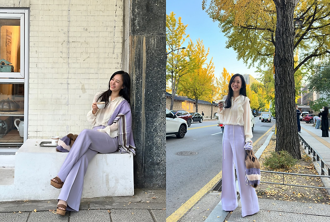 그녀는 프릴 디테일이 돋보이는 아이보리 블라우스에 파스텔톤의 라일락 와이드 팬츠를 매치했습니다.