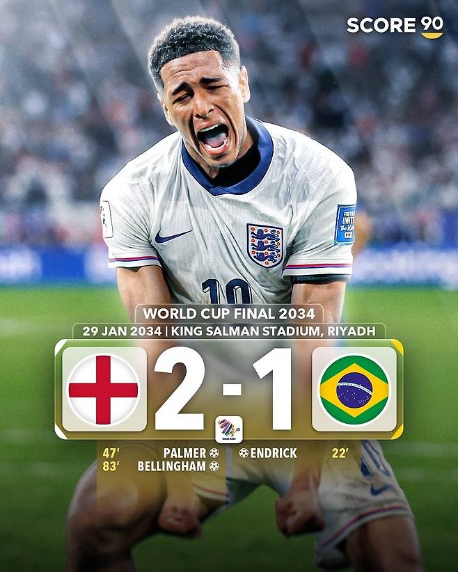 2034 월드컵 우승은 1966년 자국에서 열린 월드컵 이후 우승이 없는 잉글랜드에 돌아갈 것으로 예상됐다. 브라질의 축구천재 엔드릭에게 선제골을 실점하지만 후반전 들어 콜 팔머와 주드 벨링엄의 연속골로 경기를 뒤집는다는 시나리오다.