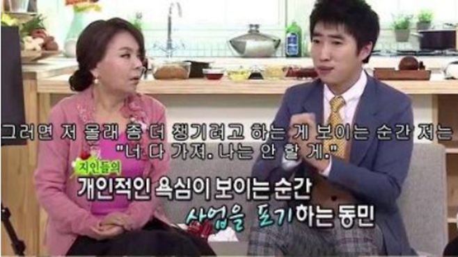 또 하나 장동민이 그 시기에 사업에서 큰 성공을 거두지 못한 데는 지인과의 돈 문제를 현실적으로 해결하지 못한 때문도 있습니다. 주로 지인들과 동업을 진행한 장동민이 사업 과정에서 금전적인 문제로 갈등이 발생했을 때, 자신의 이득을 고려해 계산하기보다는 "그냥 너 다 가져, 난 안 할게"라고 말하고 사업을 털어버린 것이지요.