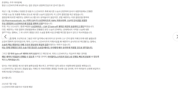 조 전 회장은 “CG인바이츠가 계약대로 협조하면서 췌장암 임상시험이 성공할 수 있도록 지원하는 것이 윈윈할 수 있는 최선의 방안이라고 생각한다”며 “이번 본안 소송 판결은 9월 말경 나올 것으로 예상한다”고 말했다. 이어 “신용규 회장의 바이오산업, 특히 신약산업에 대한 낮은 이해도 때문에 이런 상황이 벌어진 것에 대해 매우 안타깝다고 생각한다”며 ”CGP에 대한 투자가 이뤄질 수 있기를 바란다”고 덧붙였다.