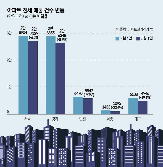 전국 아파트 전세 물건도 자취를 감추고 있다. 부동산 정보 플랫폼 ‘아파트실거래가’ 앱 통계에 따르면 최근 3개월 기준(2월 1일~5월 1일) 서울 아파트 전세 물건은 2만8904건에서 2만7129건으로 6.2% 감소했다. 경기 역시 2만8855건에서 2만6348건으로 8.7% 줄었고, 인천은 6470건에서 5847건으로 9.7% 줄었다.