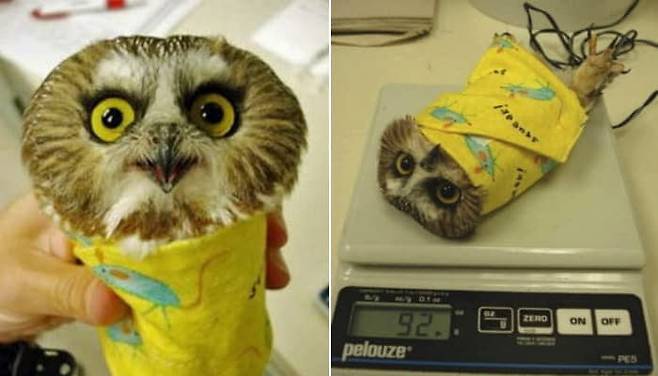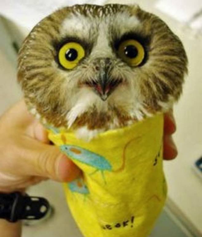 노란 담요로 돌돌 말려 당황한 아기 부엉이가 있는데요 ㅎ