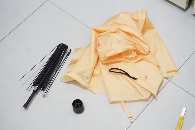 2. 우산대와 우산천(비닐)을 가위로 완전히 분리해준다.