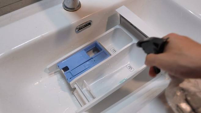 다음은 세제 투입구입니다. 이곳은 세제가 남아 곰팡이가 자라기 쉬운 곳인데요, 투입구를 분리한 후 식초물을 뿌려 깨끗이 닦아주세요.