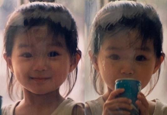 지금과 똑같은 보조개와 잔뜩 삐져나온 잔머리가 귀엽게 보입니다.