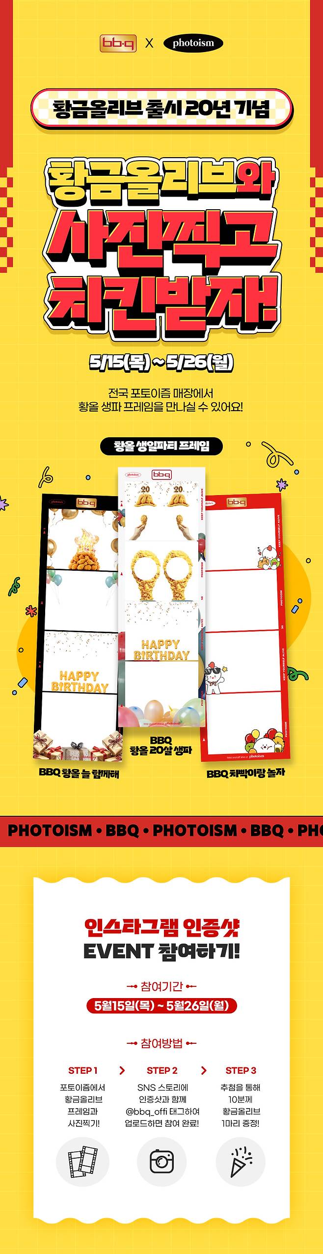 1. 전국 포토이즘 매장에서 황금올리브 치킨 20주년 기념 프레임으로 사진을 촬영합니다.