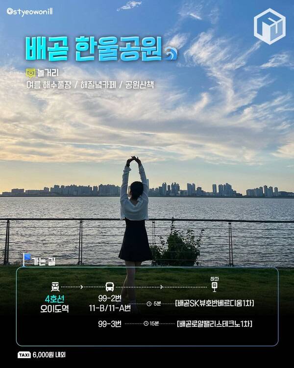 뒤로는 높은 아파트 단지가, 앞으로는 고요하고 한적한 바다가 펼쳐지는 배곧 한울공원입니다. 도심 속 바다 여행지로 접근성 또한 훌륭한데요. 4호선 오이도역에서 99‑2번, 11‑A/B번 버스로 9~11분, 또는 99‑3번 버스로 16분 이동하면 도착할 수 있습니다.