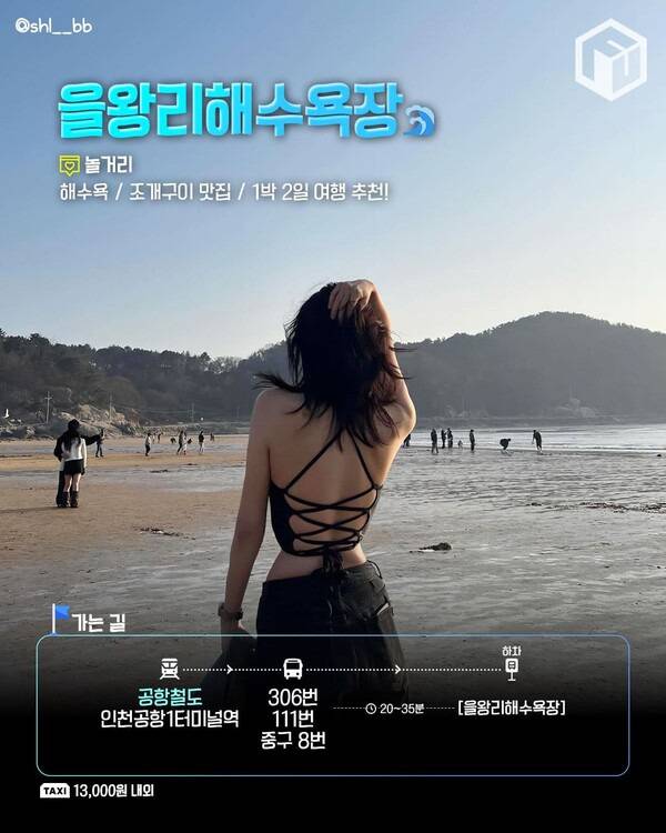 을왕리해수욕장 뚜벅이 코스는 공항철도 인천공항1터미널역에서 306·111·중구8번 버스를 타고 25분에서 35분 후 ‘을왕리해수욕장’에서 하차하면 됩니다. 택시비는 약 13,000원이며, 여름철 정식으로 해수욕장이 개장하면 저녁 즈음 곳곳에서 버스킹 공연이 진행되기도 합니다.