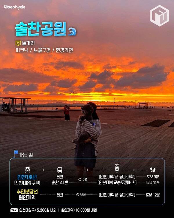 노을이 아름다운 인천 솔찬공원은, 한강공원을 연상케하지만 강이 아닌 바다가 펼쳐지는 뚜벅이 바다여행지입니다. 인천 1호선 인천대입구나 수인분당선 원인재역에서 버스를 타면 닿을 수 있는데요. 인천대학교 내에 버스 정거장이 위치해있어 버스 하차 후 약 10~15분 가량 도보 이동이 필요합니다.