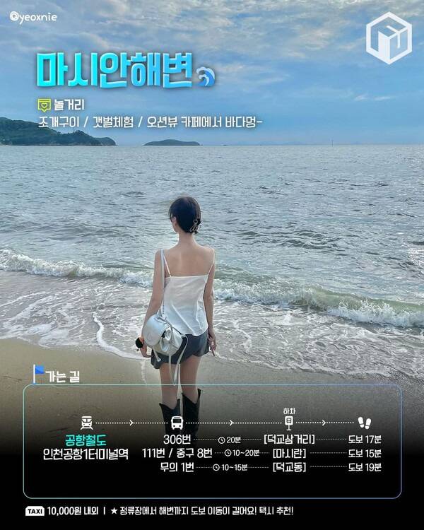 조개구이 맛집과 오션뷰 대형 카페가 모여있는 인천 마시안해변입니다. 영종도 내 여느 뚜벅이 바다여행지가 그렇듯, 공항철도 인천공항1터널역 출발, 306·111·중구8번·무의1번 버스를 이용하면 되는데요. 세 버스 모두 정거장에서 해변까지 도보 15분 이상이 소요되므로 택시 이용을 권장합니다.