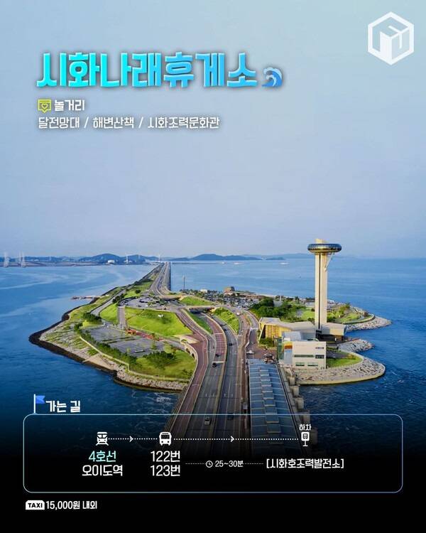 오이도역에서 122번·123번 버스로 25~30분 이동 뒤 ‘시화호조력발전소’ 정류장에서 하차하면 갈 수 있는데요. 휴게소 옆 달 전망대에서 조력발전소를 한 눈에 담을 수 있으며 시화 조력문화관에서는 미디어영상 관람 등 바다여행과 함께 문화관람까지 알차게 즐길 수 있습니다.