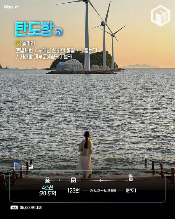 물때에 맞춰 길이 열리는 신비로운 탄도항입니다. 물때와 일몰 시기가 맞으면 풍력발전기와 함께 황홀한 일몰 풍경이 펼쳐지는 것으로 유명한 곳인데요. 앞서 소개한 지하철 바다여행지들에 비해 지하철에서 버스로 환승 후 이동시간이 긴 편입니다. 무려 1시간 10분 가량이 소요되죠.