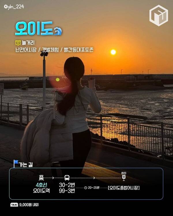 빨간 등대가 유명한 시흥 오이도는 당일치기로 다녀오기 편리한 바다 여행지입니다. 4호선 오이도역에서 30-2번, 99-3번 버스를 타면 약 20~25분 뒤 [오이도 종합어시장] 정류장에 도착합니다. 빨간등대 바로 앞에서 하차하게 되죠. 택시로는 약 9,000원이 소요됩니다.