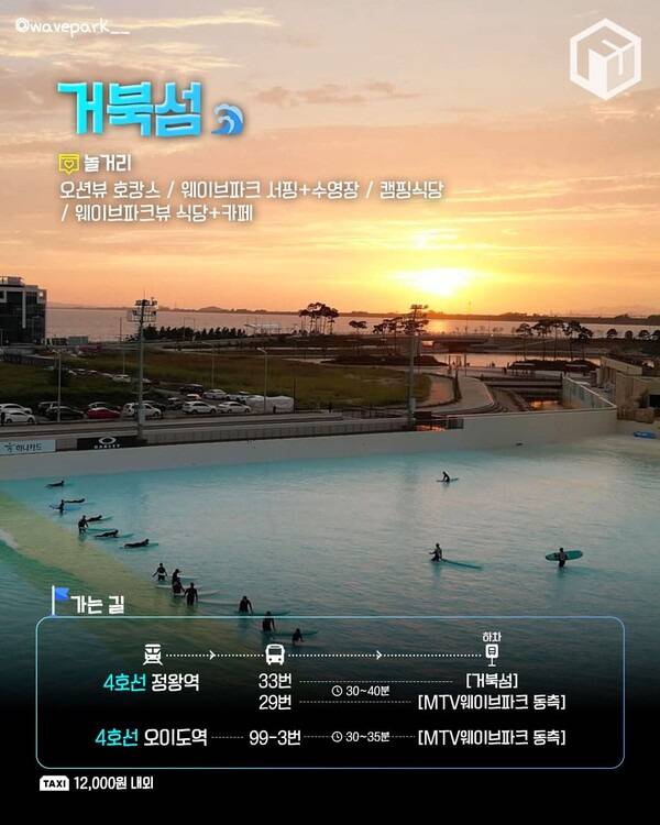 이국적인 분위기로 꾸며진 해안도시, 거북섬입니다. 인공 서핑장이 있는 웨이브파크는 파도풀장이 있는 수영장 시설도 완비되어 있어 뚜벅이 당일치기로 다녀오기 좋은 바다여행지 겸 워터파크이기도 하죠. 많은 매장이 들어서지는 않아도 매년 여름이면 찾는 분들이 많은 곳입니다.