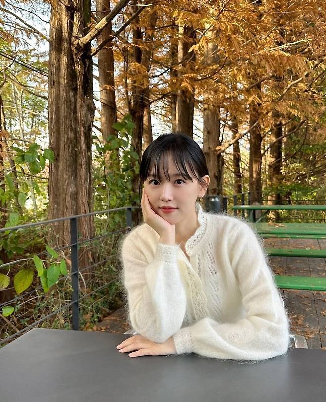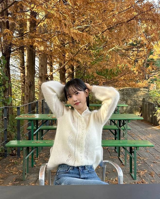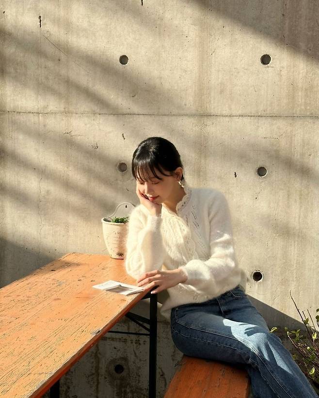 강한나는 부드러운 질감의 화이트 니트와 클래식한 데님 팬츠를 매치해 따뜻하면서도 심플한 겨울 패션을 완성했습니다.