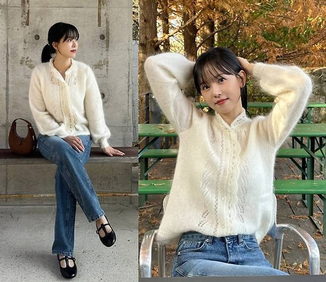 특히, 니트의 섬세한 레이스 디테일이 우아한 분위기를 배가시키며, 청바지와의 조합으로 편안함과 세련미를 동시에 잡았습니다.