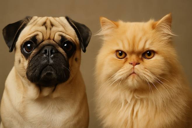 퍼그와 페르시아고양이는 짧고 납작한 얼굴, 큰 눈, 뭉툭한 주둥이라는 외형적 특징으로 잘 알려진 반려동물이다. 이들은 각각 늑대와 야생고양이를 조상으로 두고, 오랜 시간 독립적인 진화 경로를 걸어왔다.