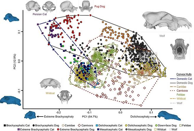 연구팀은 고양잇과와 갯과를 포함한 육식목(Carnivora) 동물 1,810개 두개골을 3D 스캔해, 47개의 형태적 특징을 정밀 분석했다. 퍼그와 페르시아고양이는 각각 다른 조상에서 출발했지만, 같은 종 내의 다른 품종이나 본래 조상들보다 서로 더 비슷한 두개골 형태를 공유하고 있었다.