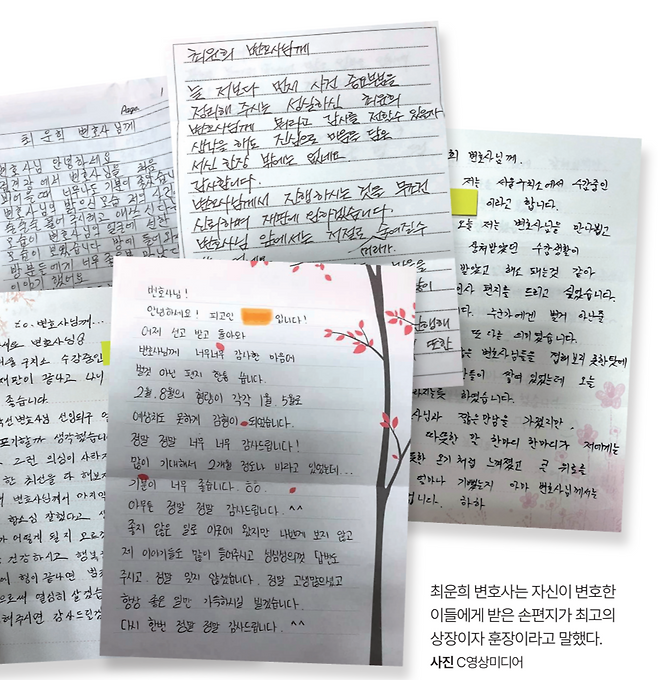 14년 동안 최 변호사가 변호한 피고인은 4000명이 넘습니다. 매년 300명 정도의 변호를 맡아온 셈입니다. 이 수고와 헌신을 인정받아 2023년 12월 서울중앙지방법원에서 선정하는 ‘우수 국선변호인’에 선정됐습니다. 최 변호사는 “우수 국선변호인상도 기쁘지만 내가 변호한 이들에게 받은 편지와 정성이 내게는 상장이자 훈장”이라고 말했습니다.