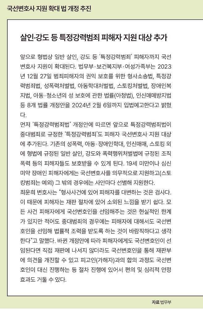 변호인이 있어야 방어권을 행사할 수 있는 형사사건에서 피고인이 변호사를 스스로 구하지 못하거나 구하지 않을 때 법원에서는 ‘국선변호인’을 선임해줍니다. 국선변호사가 변호하는 대상은 주로 사회적 약자인데요. 2010년부터 14년간 피고인 전담 국선변호사를 해온 최운희 변호사는 변호한 피고인만 4000명이 넘습니다. 피고인이 써준 수백 통의 손편지가 최고의 상장이라고 말하는 2023년 ‘우수 국선변호인' 최운희 변호사의 인터뷰를 '정책주간지 K-공감' 에서 만나보세요.