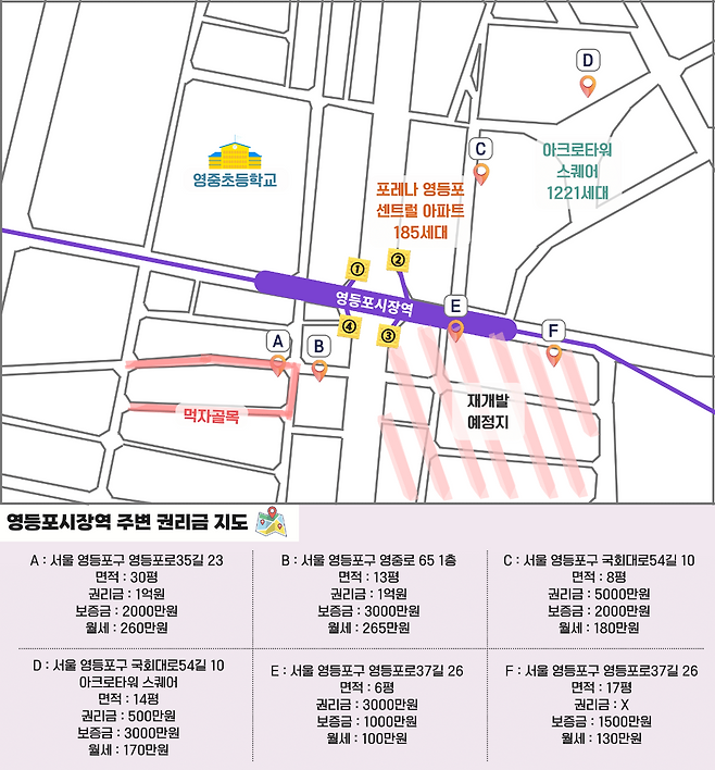 특히 영등포시장역은 출구 방향에 따라 상권 성격이 확연히 다르다. 초등학교 인접 지역은 업종 제한으로 조용하지만 2번 출구 일대는 1400세대 규모의 신축 아파트 단지가 들어서며 새 상권이 빠르게 자리잡았다. 반면 노후 건물이 몰린 3번 출구는 재개발 예정지로 장기 임대보다 단기 영업이 유리한 지역으로 꼽힌다. 이미 먹자골목이 형성된 4번 출구 주변은 유동인구가 가장 많아 권리금이 가장 높은 ‘핵심 구간’으로 통한다.