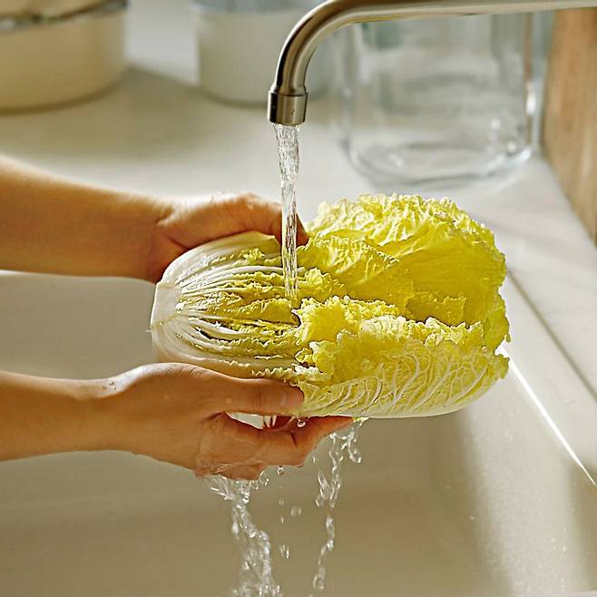 2. 깨끗이 씻은 알 배추는 1cm 폭으로 채를 썬다. 마늘은 편 썰고 쪽파는 2cm 길이로 썬다.