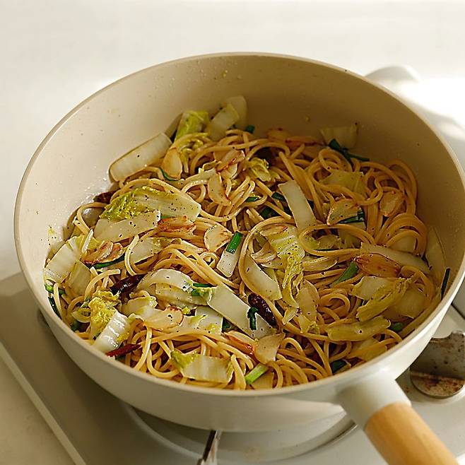 요리 과정에서 알 배추는 같은 크기의 잎을 겹쳐 썰어주시면 동일한 크기로 썰 수 있습니다.파스타가 완성되면, 긴 젓가락으로 면을 돌돌 말아 접시에 가지런히 담습니다. 위에 배춧잎과 마늘을 올려주면 더욱 먹음직스러워 보입니다.