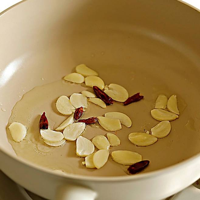 3. 팬에 식용유를 두르고 편 썬 마늘과 페퍼론치노를 넣고 약불에서 볶는다. 알 배추 줄기 부분을 넣고 1분간 다시 볶는다.