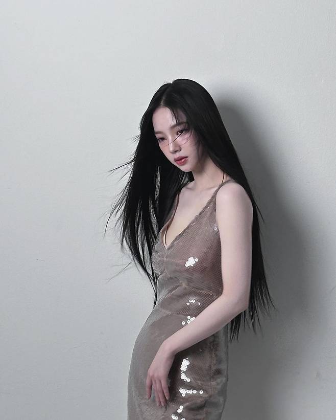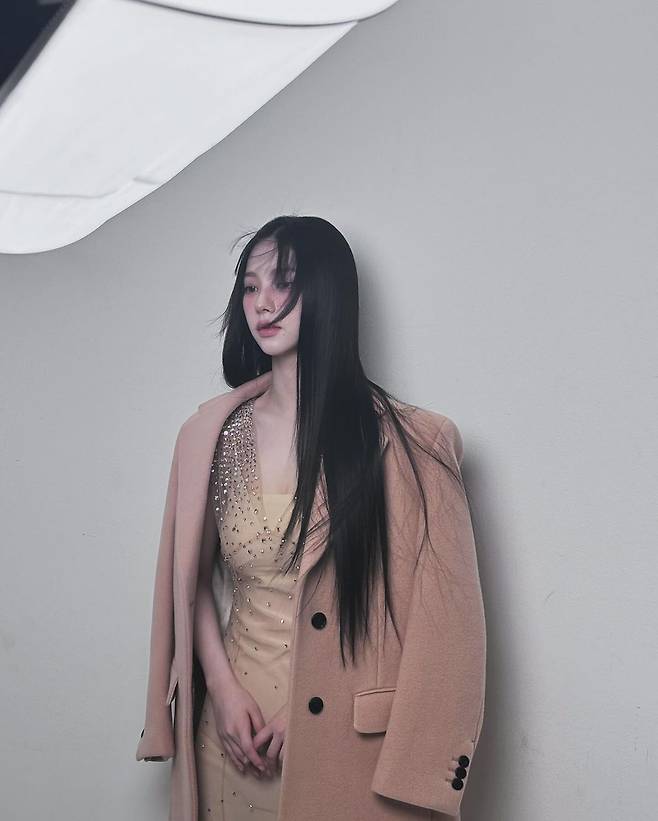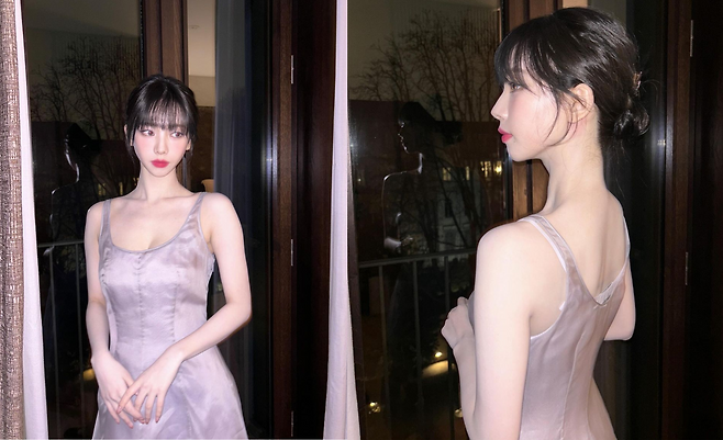 사진 속 카리나는 연보라빛 실크 슬리브리스 드레스를 입고 여신 미모를 자랑하며 청순하고 우아한 모습을 선보였다.