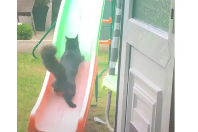영상을 촬영한 사람은 이 모습을 꾸준히 기록했습니다. 고양이는 미끄럼틀을 빠르게 오르더니 다시 미끄러져 내려왔습니다.