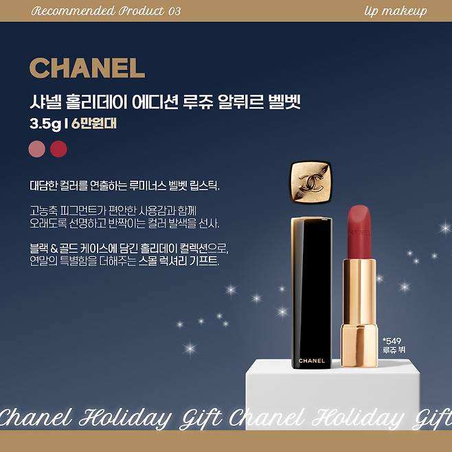 앞서 소개한 2025 사넬 홀리데이 립과 아주 찰떡궁합을 이루는 제품이라, 함께 선물로도 추천한다.