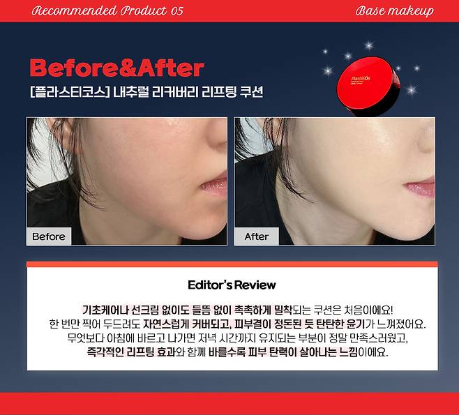 기초케어나 선크림을 생략해도 피부에 들뜸 없이 밀착되는 쿠션은 처음이었다. 가볍게 두드리면 크리미한 제형이 피부에 쫀쫀하게 스며들며, 피부결이 매끈하게 정돈되고 리프팅과 커버가 동시에 이루어졌다.