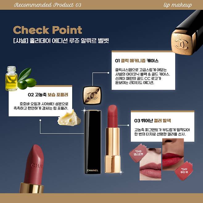 샤넬의 루쥬 알뤼르 벨벳은 입술 위에 가볍게 녹아드는 벨벳 텍스처로 부드럽게 발린 후 밀착되어 오랜 시간 선명한 컬러감을 유지한다. 벨벳 립이지만 건조하지 않아 자연스러운 윤기를 남기며, 립 하나만으로도 연말 룩의 전체 무드를 완성해 줄 수 있다.