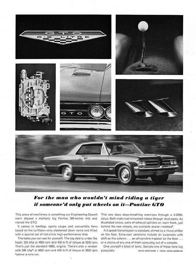 1964년, 폰티악(Pontiac)은 중형 세단 템페스트(Tempest)에 새로운 옵션 패키지를 얹어 시장에 내놓았다. 이름은 GTO(Gran Turismo Omologato). 본래 FIA 레이스 인증 차량에 붙는 이탈리아식 명칭을 과감히 차용한 것이었다. 이는 명백히 페라리 250 GTO를 겨냥한 것이었고, 당시 6배 비싼 슈퍼카와 자신들을 동일선상에 올려놓는 대담한 선언이었다.