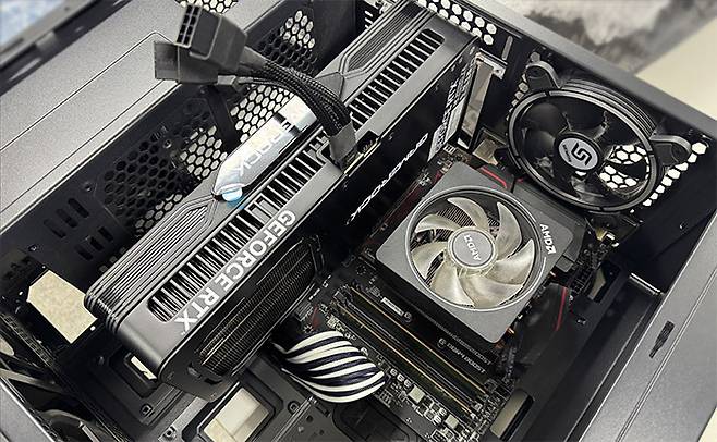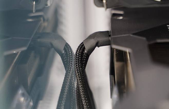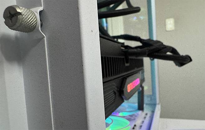 가뜩이나 소비전력이 높아져 16핀 전원 케이블에 부하가 증가했는데, 이렇게 무리하게 꺾으면 단선이 일어나 화재가 있어나지 않을까 걱정되는 부분이다. RTX 5090에서는 600W에 달한다고 하니 더욱 그렇다. 하지만, 이런 고민도 165mm CPU 쿨러를 장착할 수 있는 케이스에서나 누릴 수 있는 호사다. 그보다 얇은 케이스는 물리적으로 사이드 패널을 닫을 수 없다.