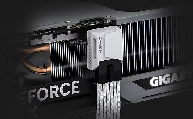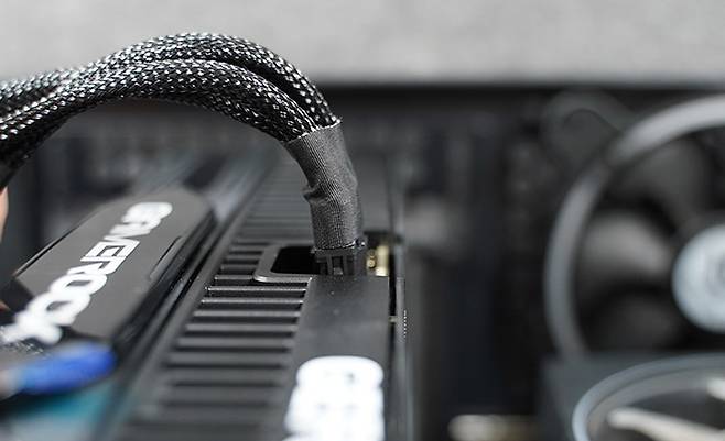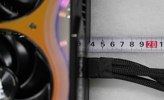 RTX 5080 상단 한가운데에는 이 16핀 전원을 연결하는 접속부가 존재한다. 그래픽 카드를 구입하면 파워 서플라이에서 나오는 8핀 PCIe 커넥터 3개를 16핀으로 합해주는 변환 젠더를 제공받는다. 이 번들 젠더를 연결하면 140mm 본체 길이에서 약 25mm 공간을 더 차지하는 것이다. 이 상태로 사이드 패널을 닫게 되면 아예 닫히지 않거나 사이드 패널 내부에 16핀 커넥터의 수축 튜브 쪽이 꺾인 상태에서 접촉하게 된다.