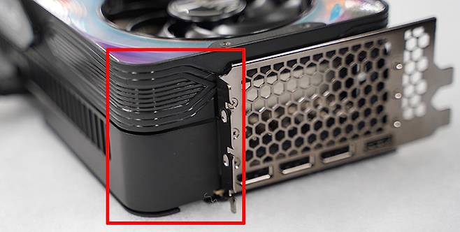 더불어 주목할 점은 바로 세로 길이다. 흔히 그래픽 카드의 스펙표에는 가로 길이와 두께만 표시되는 게 일반적이다. 잘 알다시피 가로 길이는 PC 케이스의 전면부와 후면부 사이의 길이에 그래픽 카드가 수납(?)될 수 있느냐를 판가름하는 척도가 된다. 그래픽 카드를 장착하는 데 가장 먼저 넘어야 할 산이기도 하다. 그리고 두께는 케이스 후면의 PCI 칸 수를 결정한다. PALIT 제품의 경우 실제 조립해 보면 3칸 반 정도 차지한다. 캡처카드나 사운드 카드 같은 추가 PCI 기판이 있다면 꼭 고려해 봐야할 사항이다.