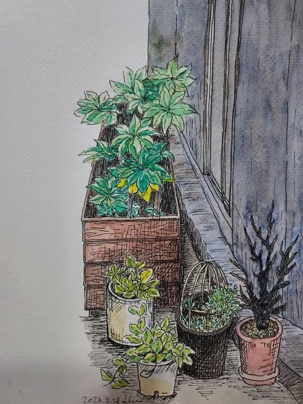 | ▲ 화분에 식물, 수채화 어반스케치 수업 중에 |