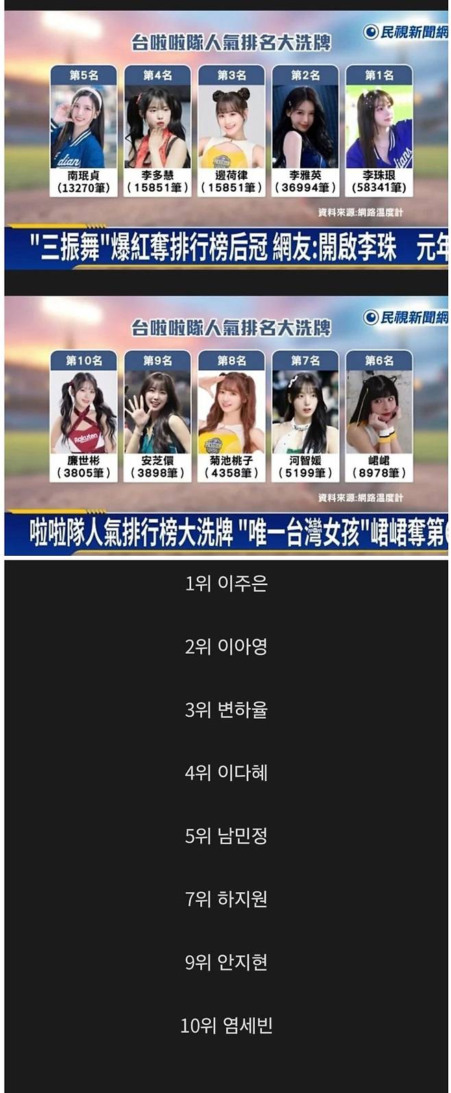 상위 10명 중 8명이 한국 치어리더라고 하네요