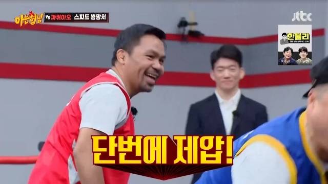 파퀴아오가 먼저 몸을 움직였지만 강호동은 꼼짝도 않고 버텨냈고, 되레 파퀴아오가 앞쪽으로 날아갔다. 강호동은 엉덩이가 얼얼한 파퀴아오를 바라보며 웃음지었다.