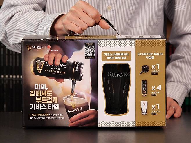 ‘기네스 나이트로 서지 스타터팩’은 다음과 같은 구성이다. 질소 거품을 만들어주는 ‘기네스 나이트로 서지 디바이스’, 그리고 ‘기네스 나이트로 서지 전용 캔’ 4개 마지막으로 ‘기네스 나이트로 서지 전용 잔’이다.