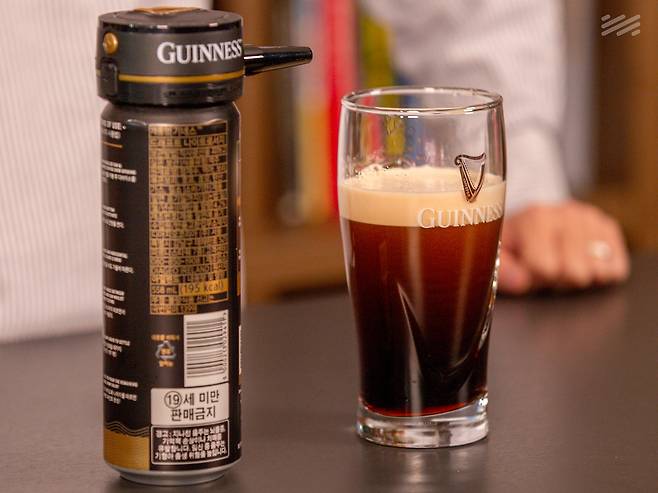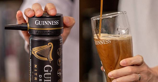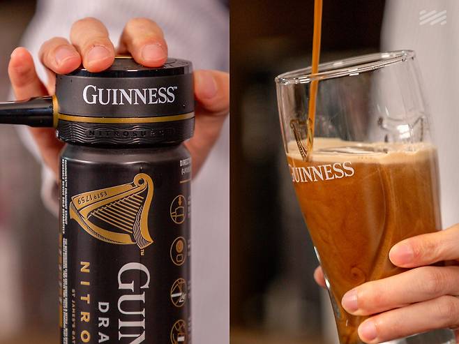 가장 비슷한 환경에서 비교는 ‘기네스 캔’과의 비교다. 기네스 캔 역시 정해진 방법만 따르면 만족스러운 한 잔을 즐길 수 있다. 그럼에도 기네스 나이트로 서지와 큰 차이점이라면.