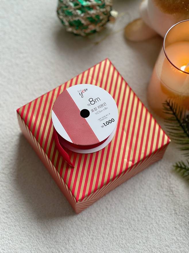 이제 8mm 리본 끈을 사용해 볼륨감을 더해 선물 포장을 화려하게 만들어 주려고 합니다.