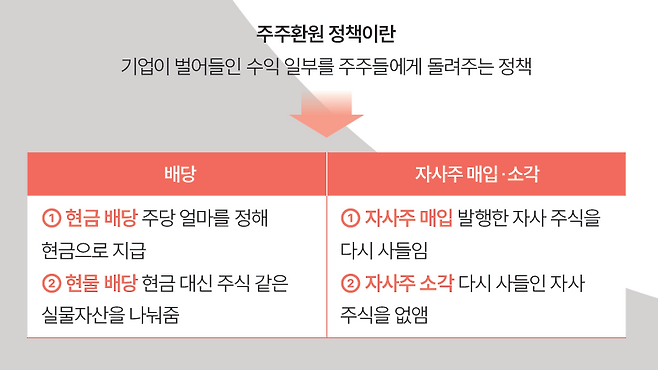 주주환원이란 기업이 벌어들인 수익의 일부를 주주(투자자)에게 돌려주는 것을 뜻합니다. 말 그대로 주주에게 이익을 되돌려주는 정책입니다. 그렇다면 기업은 대체 왜 이런 결정을 할까요? 주가와 관련이 있습니다. 주주에게 이익을 돌려주면 주주들은 그 주식을 팔지 않고 오래 가지고 있을 확률이 높아집니다. 이익을 얻을 수 있다는 기대로 주주들이 더 유입되기도 합니다. 다시 말해 투자자도 늘어나고 주가가 더 오를 것이라는 기대가 커지겠죠.