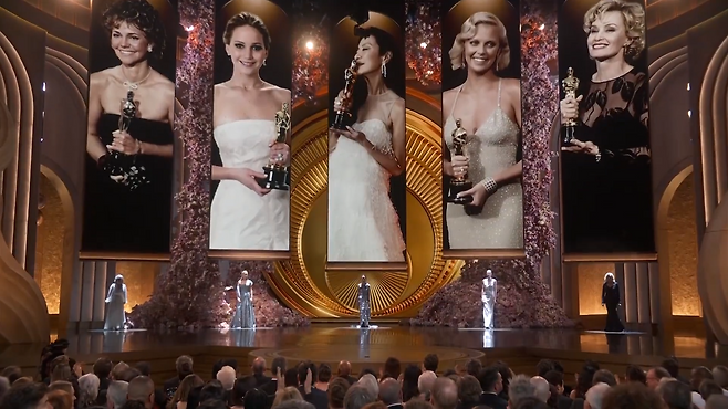 뒤이어 시상식 막바지에는 여우주연상의 발표가 있었다. 이번 시상에는 셀리 필드, 제니퍼 로렌스, 양자경, 샤를리즈 테론, 제시카 랭이 함께 등장했으며, 역시나 지난해 수상자인 양자경이 '가여운 것들'에서 열연을 펼친 엠마 스톤을 호명하고 트로피를 전달했다.