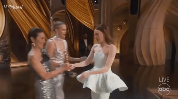 '라라랜드'에 이어 두 번째 여우주연상을 수상하는 영광을 안은 엠마 스톤. 하지만 트로피를 전해주는 양자경과는 짧게 눈만 마주쳤을 뿐이며, 옆에 서있던 제니퍼 로렌스에게 다시 트로피를 건네받고 뜨거운 포옹을 하는 미묘한 그림을 연출했다.